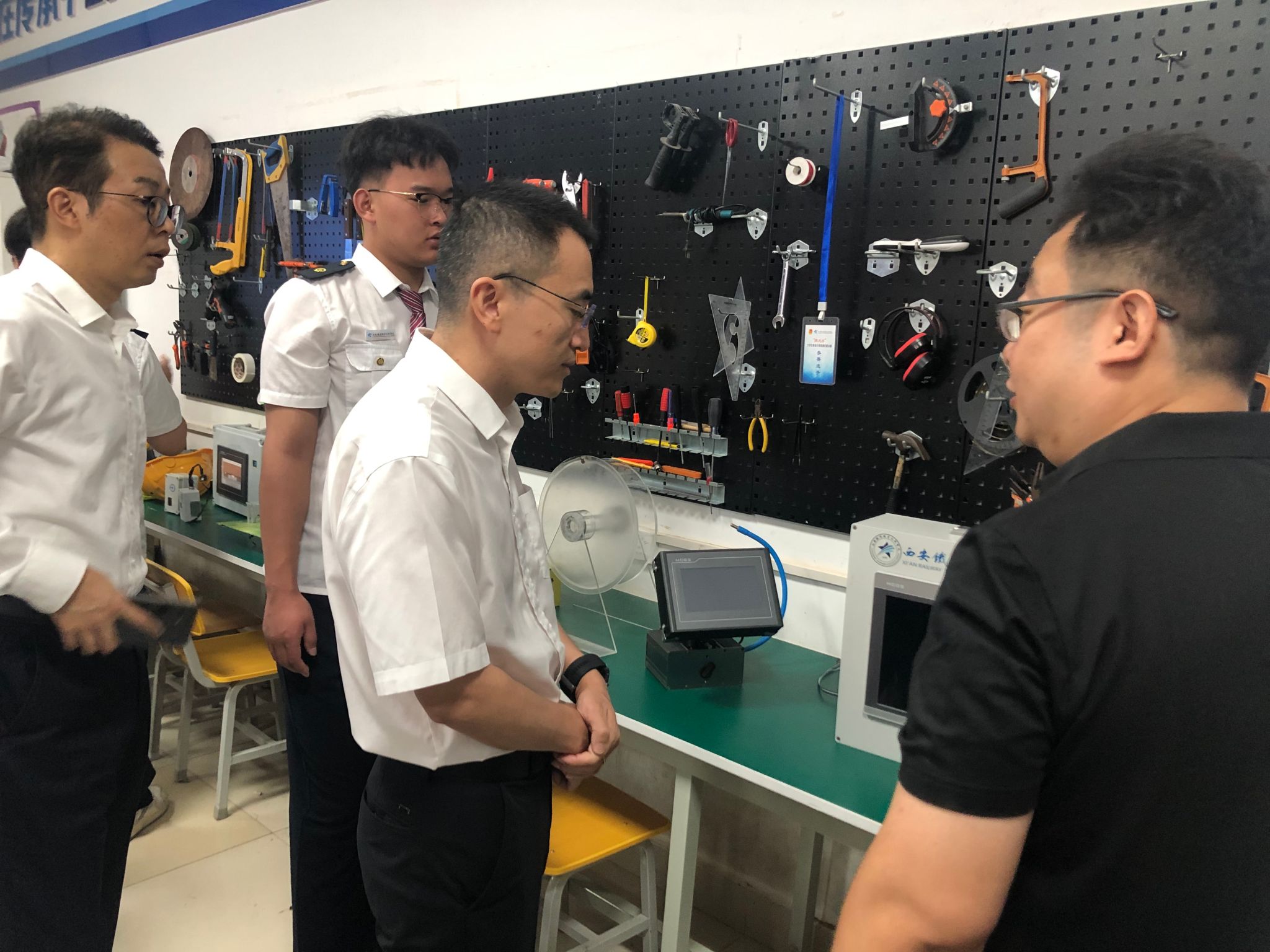 赵宝刚一行在靳丽君、黄凯等陪同下,先后参观了未来教育科技创新基地、牵引动力学院实训基地及机电工程学院创新工作室。实地考察了国家级虚拟仿真实训基地、地铁及高铁模拟驾驶实训中心等设施,对学院在轨道交通领域的高水平实训能力给予高度评价。
